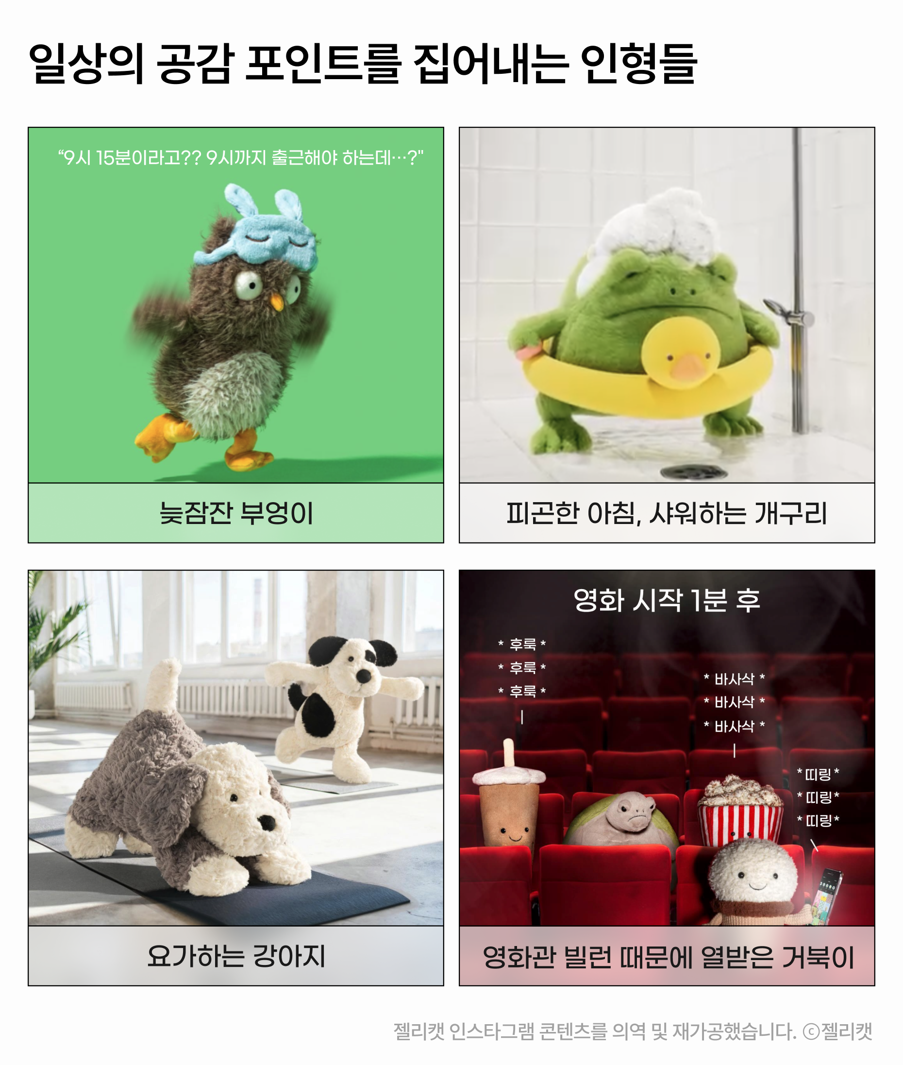 젤리캣이 올리는 내용은 크게 두 가지예요. 새 인형을 소개하거나, 기존 인형을 활용해 메시지를 담은 이미지를 올리죠.