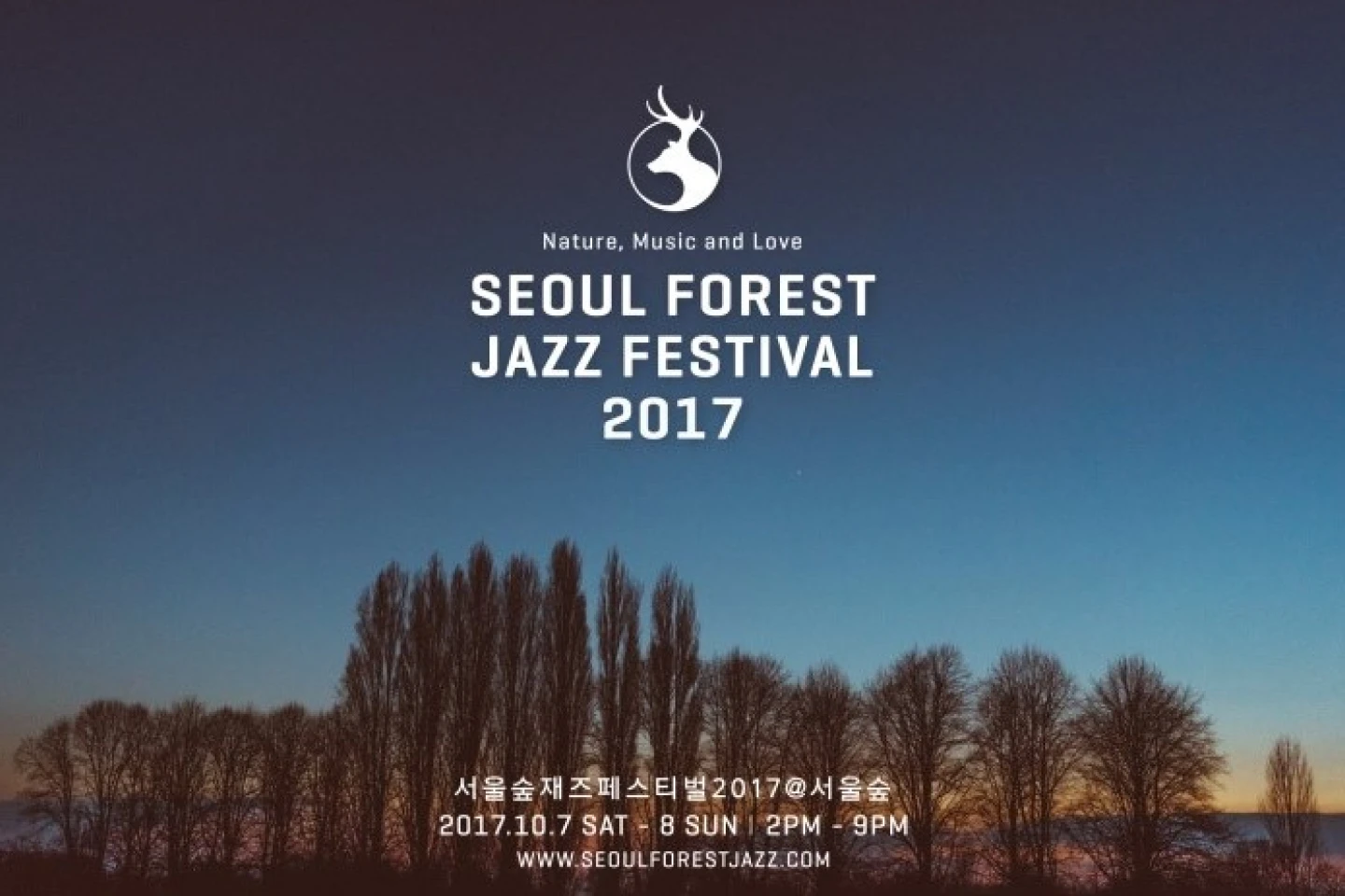 2017년, 제1회 서울숲재즈페스티벌의 포스터를 볼까요. 고즈넉한 느낌의 사진이 포스터를 가득 채웁니다. 새벽녘의 짙푸른 하늘, 울창한 숲 사이로 어슴푸레 아침 햇빛이 새어 나와요. 이 감성적인 사진 위엔 사슴 모양의 심볼이 그려져 있어요. 그리고선 행사명과 장소, 그리고 시간.