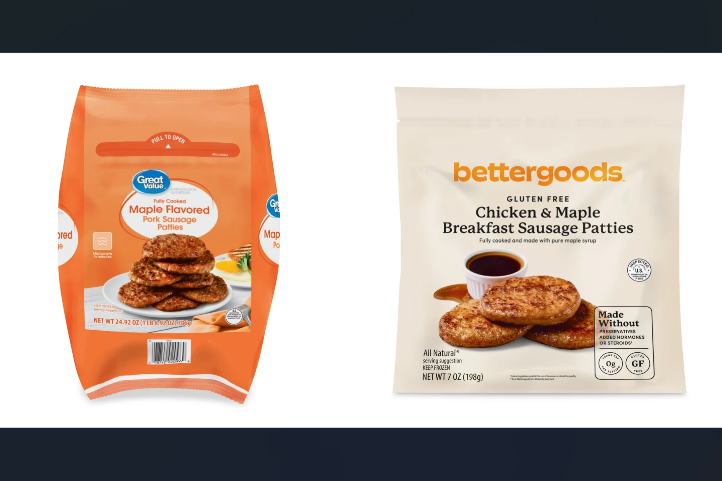 반면 기존 월마트의 PB 라인인 그레이트 밸류Great value의 패티류는 어떨까요? 냉동 메이플 돼지 소시지 패티가 706g에 8.78달러(약 1만2100원)이에요. 100g당 약 1.25달러(약 1720원)인 셈이죠.