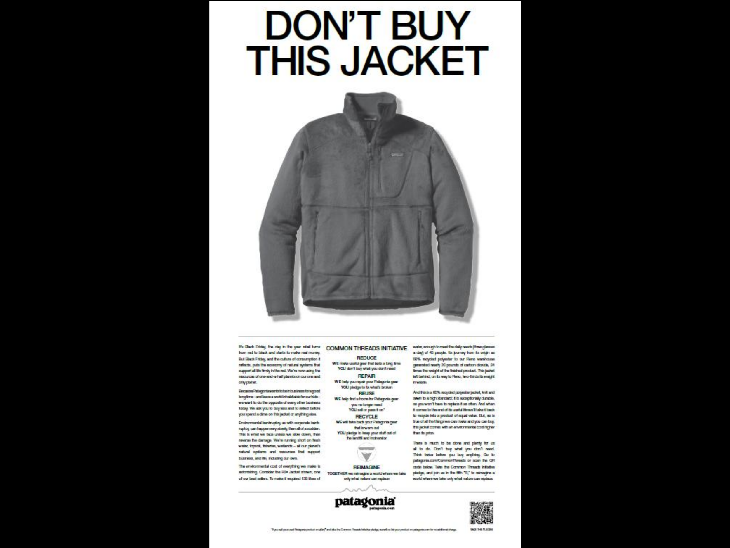 그러나 문제는 남았죠. 어쨌든 파타고니아도 매년 새 옷을 출시한다는 것. 이에 파타고니아는 파격적인 캠페인을 기획합니다.
