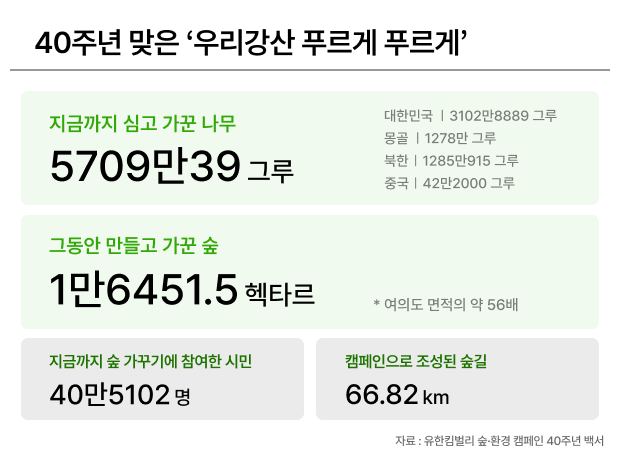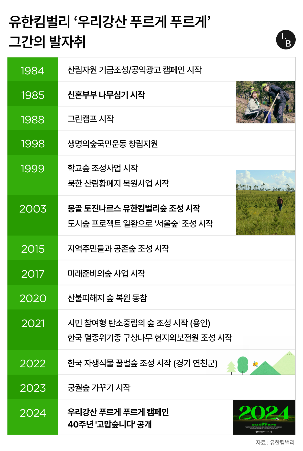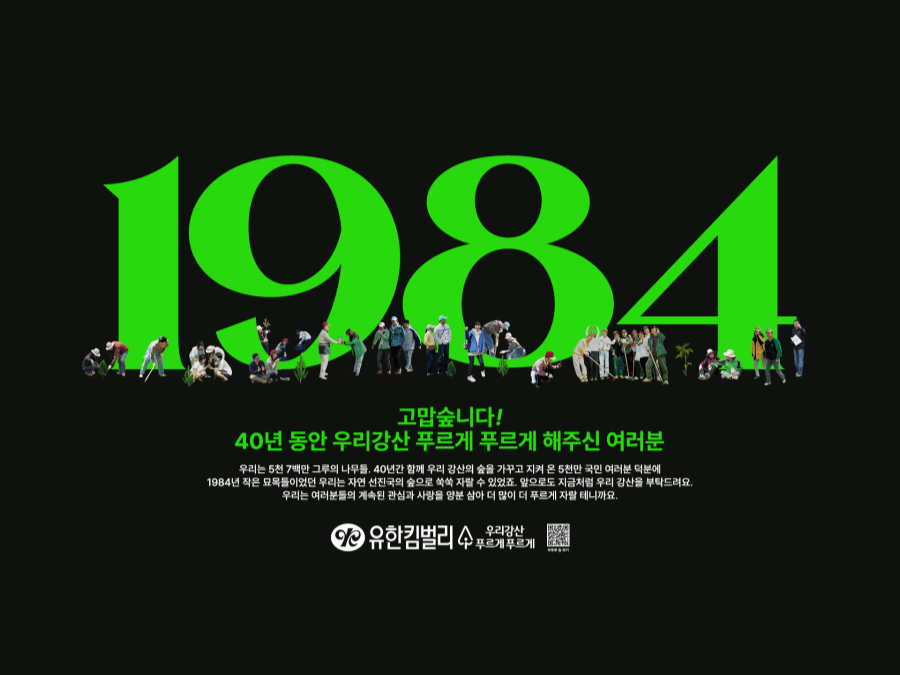 유한킴벌리의 ‘우리강산 푸르게 푸르게’ 캠페인이 40주년을 맞았습니다. 1984년부터 숲의 가치를 알려 온, 국내 최장수 숲·환경 공익 캠페인입니다. 지금까지 이 회사가 심고 가꾼 나무는 모두 5700만여 그루. 국내외 1277곳에 크고 작은 숲을 만들고, 가꾸고, 알렸습니다.