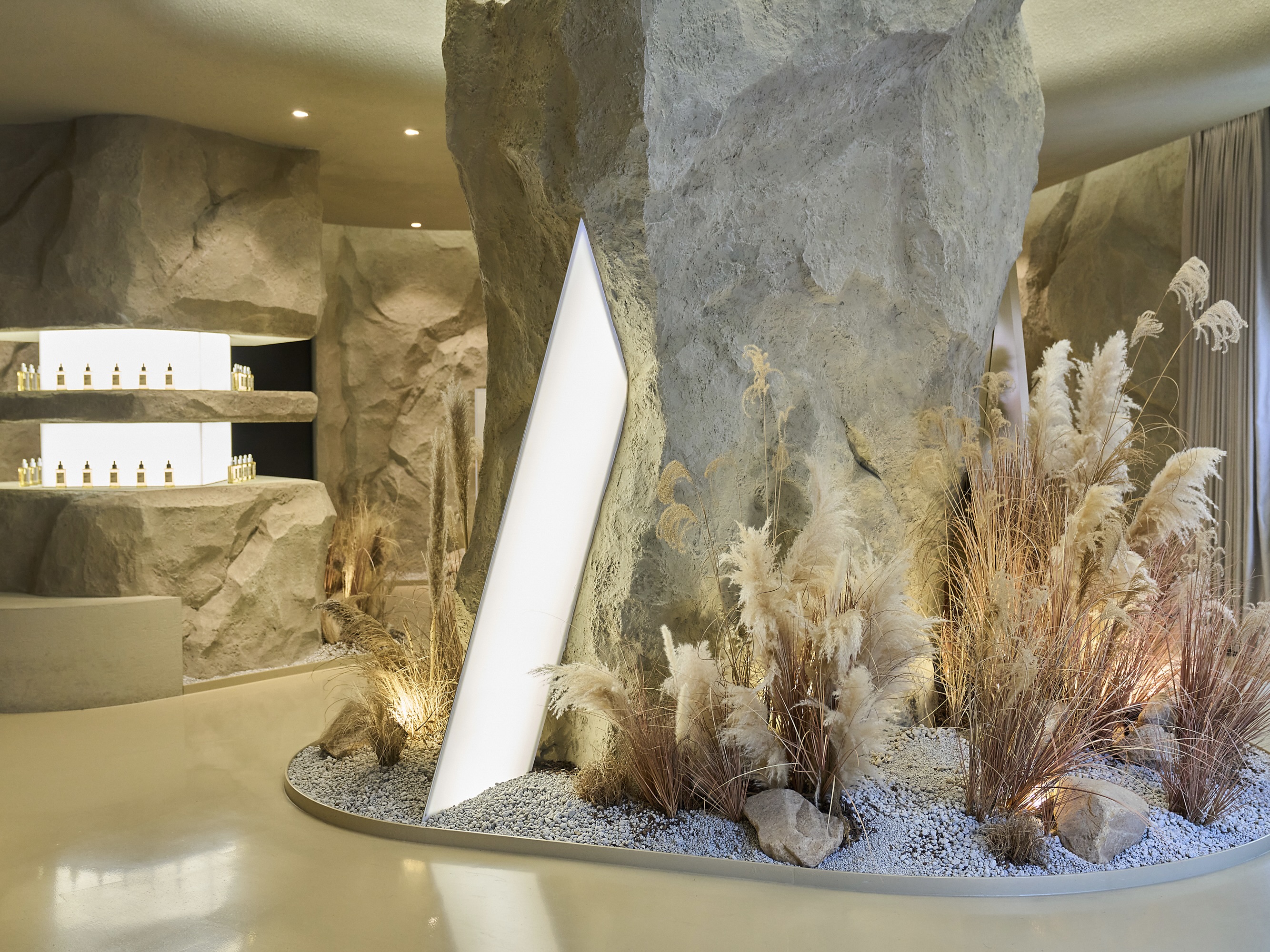 들어가 보니 매장 내부도 온통 모래 빛깔이야. 한 가운데엔 커다란 바위 구조물이 서 있어. 마른풀들이 바위틈을 채우고 있어. 브랜드 슬로건은 ‘태초의 자연’.
