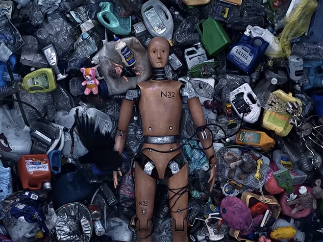 그래, 비가 추적추적 오는데 쓰레기 더미 속에 나무 마네킹이 누워있어. 섬뜩한 기계음이 흐르고 이런 자막이 뜨지.