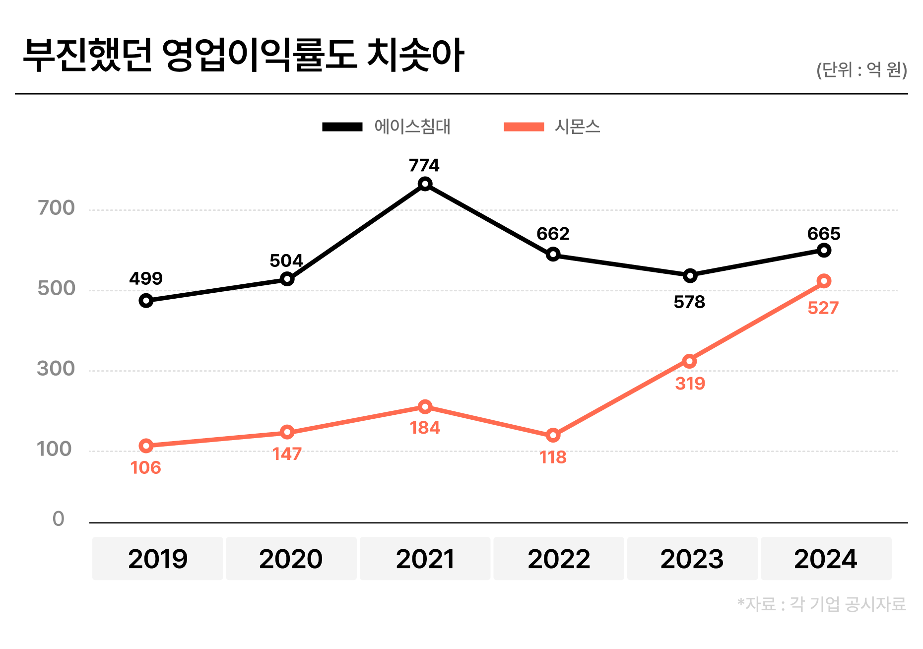 2024년 지금은? 에이스의 수익성은 여전히 탄탄해. 지난해 664억원, 매출 대비 20.3%의 이익을 냈지. 시몬스는? 많이 올라왔어. 527억원(15.9%)으로 역대 최대치야.