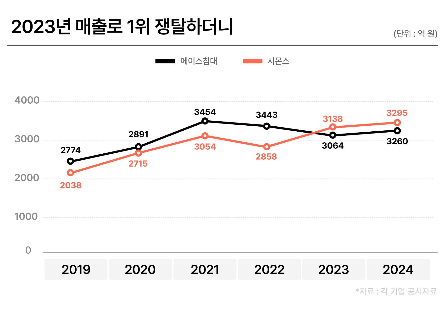 완전히 역전됐어. 시몬스 매출은 2023년 3137억원, 2024년 3295억원으로 2년 연속 성장했어. 반면 에이스는 2023년 매출(3064억원)이 전년 대비 11.5% 꺾이면서 1위 자리를 처음으로 내줬지. 2024년 매출(3260억원)도 시몬스에 35억원 뒤졌고.