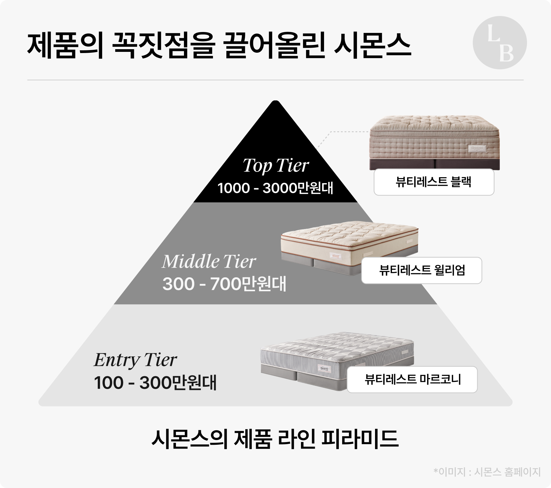 시몬스는 ‘꼭짓점 이동’으로 브랜드 포지션을 끌어올렸어. 무슨 꼭짓점이냐고? 제품 피라미드의 꼭짓점이야.