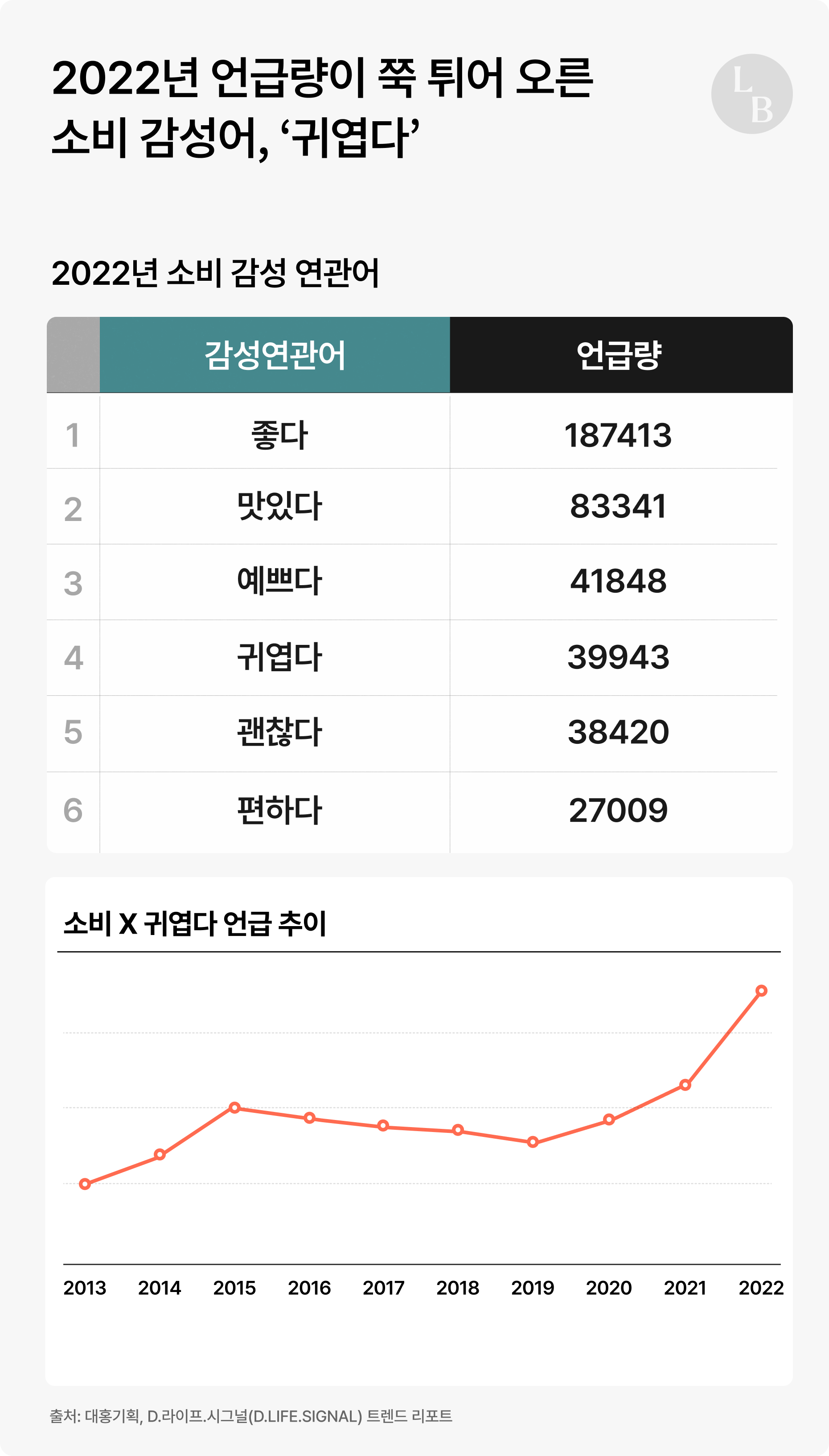 그때 팀원이 보여준 단어가 ‘귀엽다’ 였어요. ‘구매하다’와 ‘사다’ 같은 소비와 연결된 감정 표현 순위에서 4위*에 올라와 있었죠. 2년 전까지만 해도 10위권 밖이었던 게 급상승한 거였어요. 4~5위권에 있던 ‘괜찮다’를 뒤로 밀어내면서요.