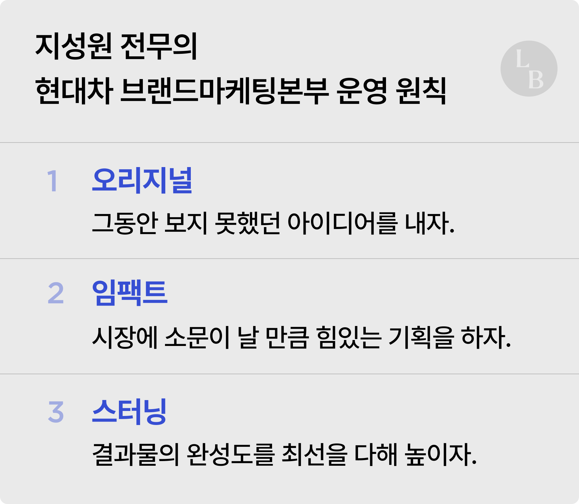 현대차 경영진 분들은 이걸 잘 알고 있다. ‘우리 이제 영업 잘하니까 마케팅도 투자해 볼까?’ 이 순서가 아니다. 연구소는 연구소대로, 영업은 영업대로, 마케팅은 마케팅대로 각 분야에서 1등을 해야 하는 거다.”