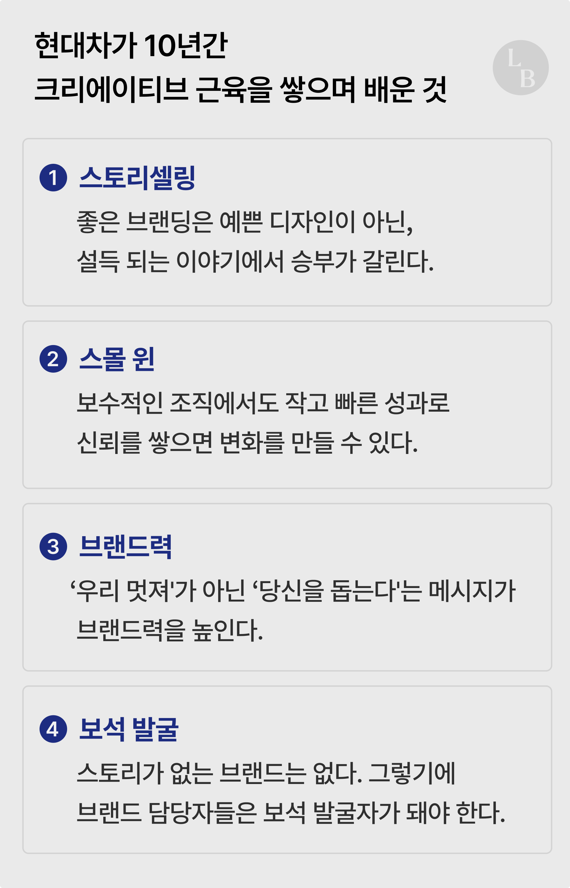 궁금해졌어. 현대차는 제조업체잖아. 이렇게 브랜딩에 힘을 준다고 사업에 큰 도움이 될까? 창의적인 브랜드 캠페인보다, 오히려 개별 제품의 기능을 알리는 마케팅이 사업에 더 중요한 건 아닐까?