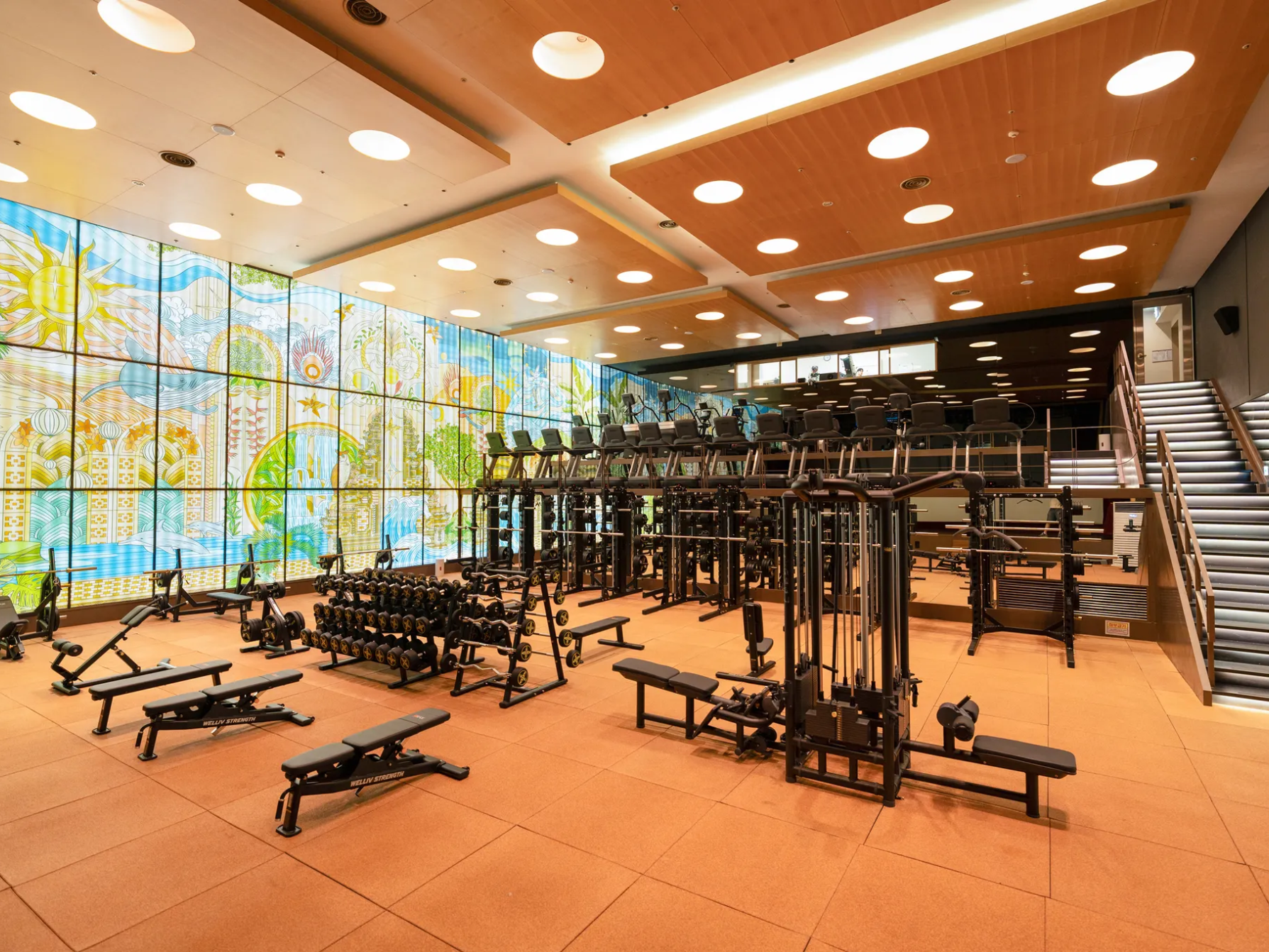 이름은 ‘리조트 휘트니스Resort Fitness’. 인테리어가 딱 그랬습니다. 입구의 라운지는 한낮 동남아 해변을 닮았어요. 라탄 테이블과 의자, 짚으로 엮은 파라솔과 등나무 조명이 이국적이었죠. 운동 공간은 반대로 밤의 클럽 같더군요. 창문은 스테인드글라스로 신비로웠고, 대형 화면에선 끊임없이 파도가 치고 있었죠.