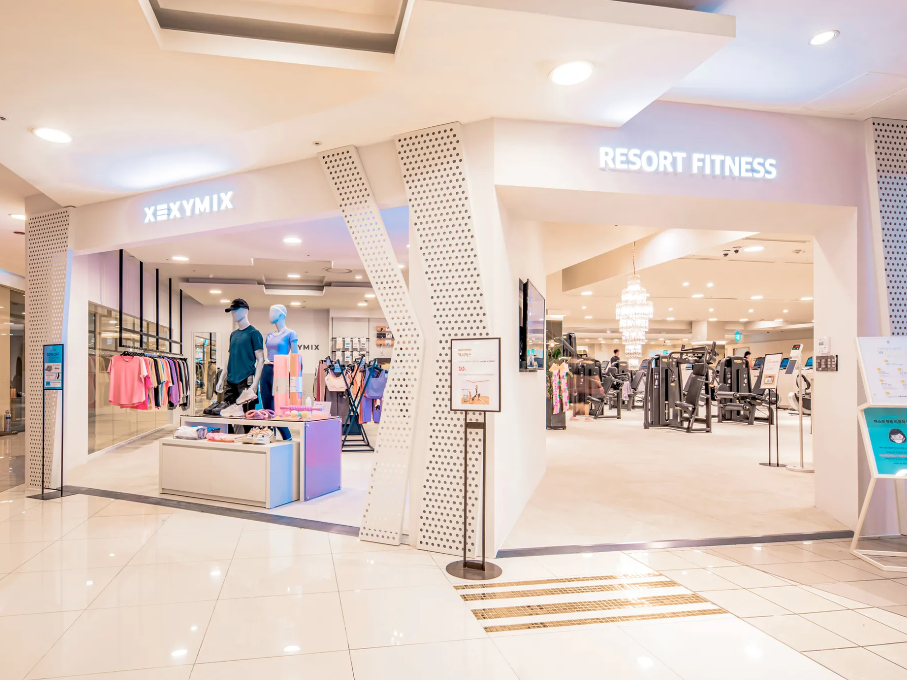 핵심 전략은 전면 노출이었어요. 밖에서 헬스장이 훤히 보여야 한다고 생각했죠. 벽 대신 긴 샹들리에로 공간을 분리했어요. 옷을 사러 온 손님들이 헬스장을 기웃거렸죠.