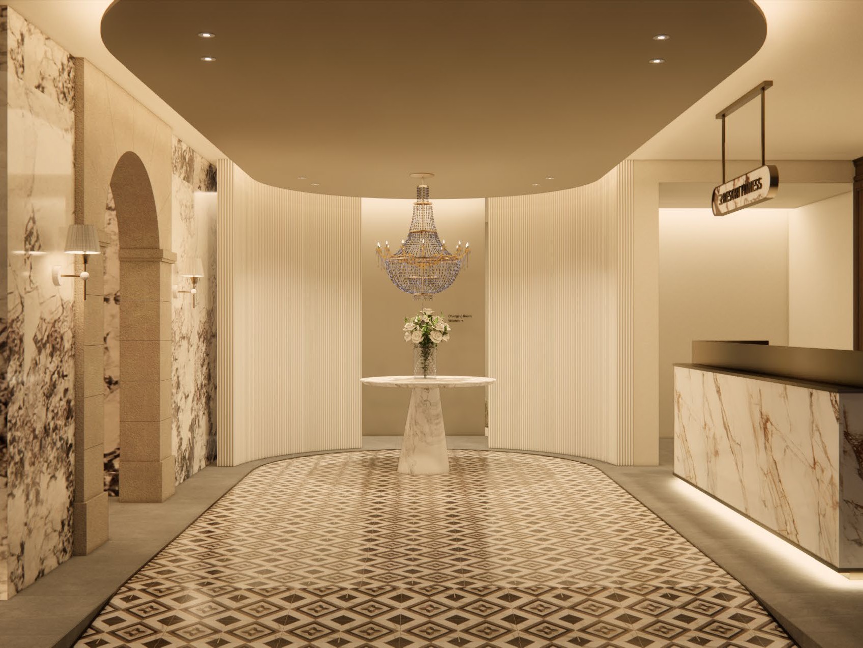 단순한 중심지가 아니라 ‘자부심이 넘치는 곳’이라 느꼈습니다. 고민하다 프랑스에서 귀족의 저택을 뜻하는 ‘샤토Château’라는 키워드를 도출했어요. 프랑스에서 ‘샤토’는 성 뿐 아니라, 귀족의 문화를 상징하는 단어거든요. 입구부터 카펫을 깔고, 헬스장 안은 물론 화장실과 탈의실까지 우아하게 마감했습니다.