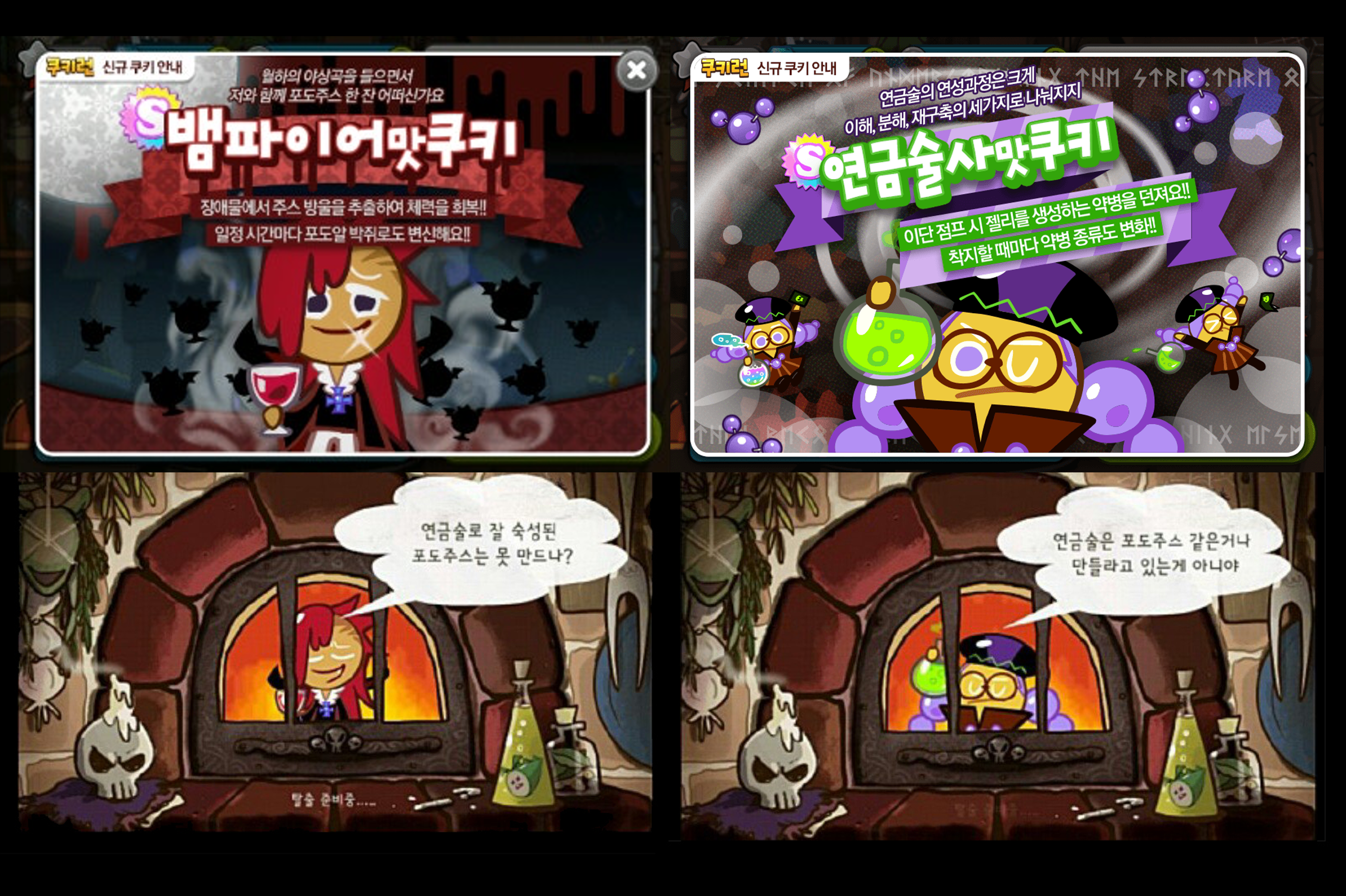예를 들면 연금술사맛 쿠키와 뱀파이어맛 쿠키는 모두 ‘포도’를 모티브로 하거든요. 그래서 이 두 쿠키가 남매라고 설정하는 식이에요. 똑똑한 연금술사 동생과 한량 뱀파이어 오빠가 티격태격하는 모습을 그려냈죠.