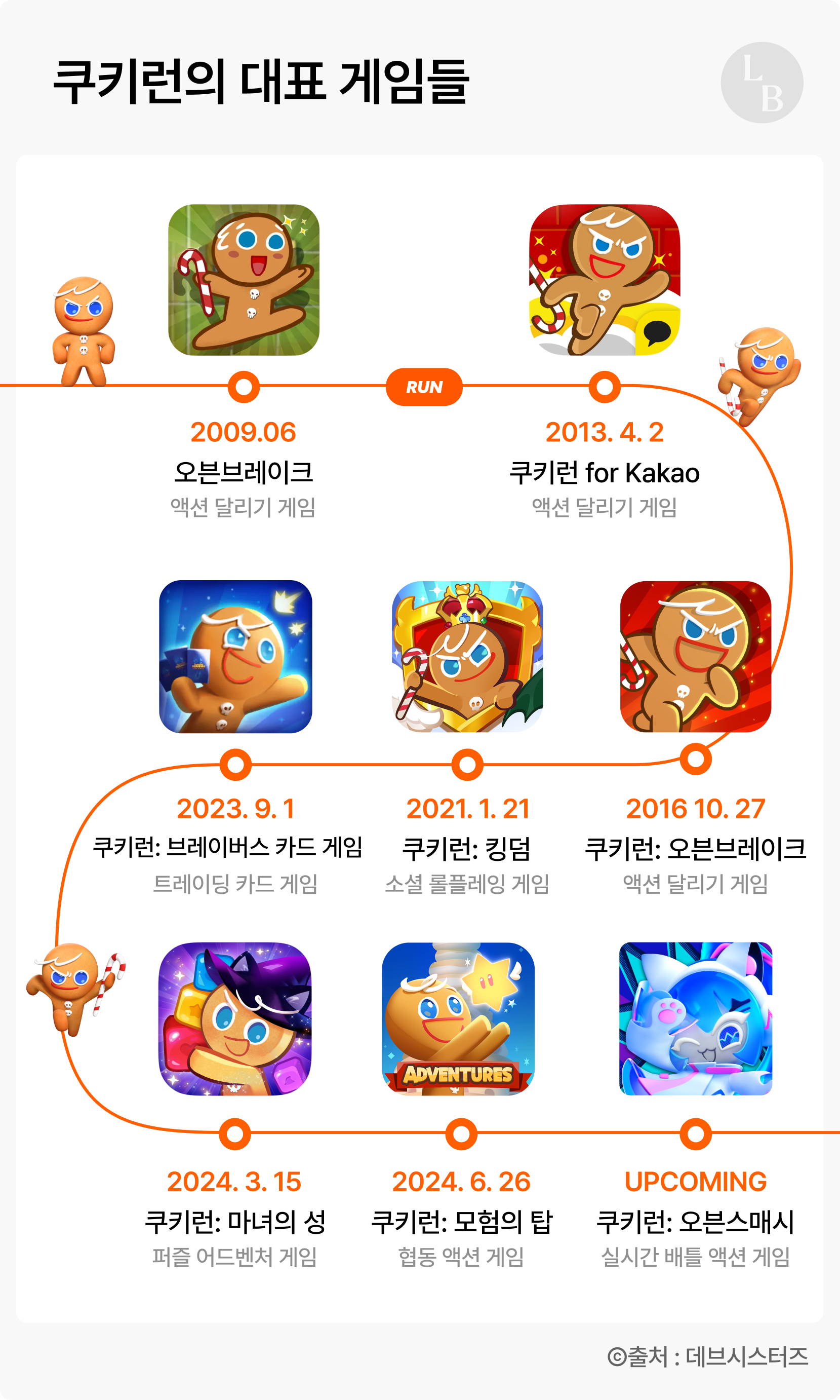 쿠킹덤 성공 이후 데브시스터즈는 쿠키런을 더 다양하게 확장하고 있어요. 퍼즐 어드벤처 게임(쿠키런: 마녀의 성), 협동 액션 게임(쿠키런: 모험의 탑), 트레이딩 카드 게임(쿠키런: 브레이버스)을 순차적으로 내놓았죠. 2026년에는 실시간 배틀 액션 게임(쿠키런: 오븐스매시)도 런칭할 계획이에요.