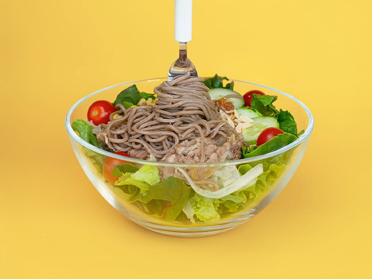 샐러디의 베스트셀러인 ‘우삼겹 메밀면’을 볼까? 메밀면이 그릇을 가득 채우고, 기름기가 도는 우삼겹이 면 위를 뒤덮어. 부지런히 먹다 보면 어느새 양상추와 오이, 양파, 아몬드, 땅콩이 오독오독 씹히지.