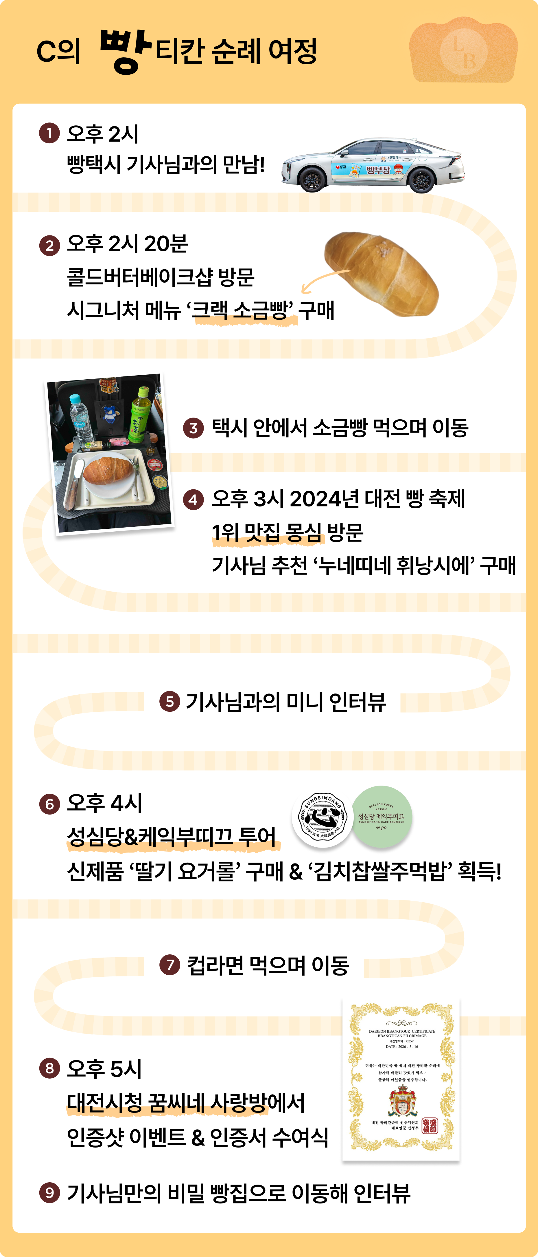 이번에도 아이디어를 곧장 실현하기엔 한계가 있었어요. 대전이 빵으로 유명한 건 알고 있었지만, 그가 모든 곳을 꿰고 있던 건 아니었거든요. 그래서 그는 ‘테마 택시’를 먼저 실험하면서 빵집을 취재하는 길을 택했어요.