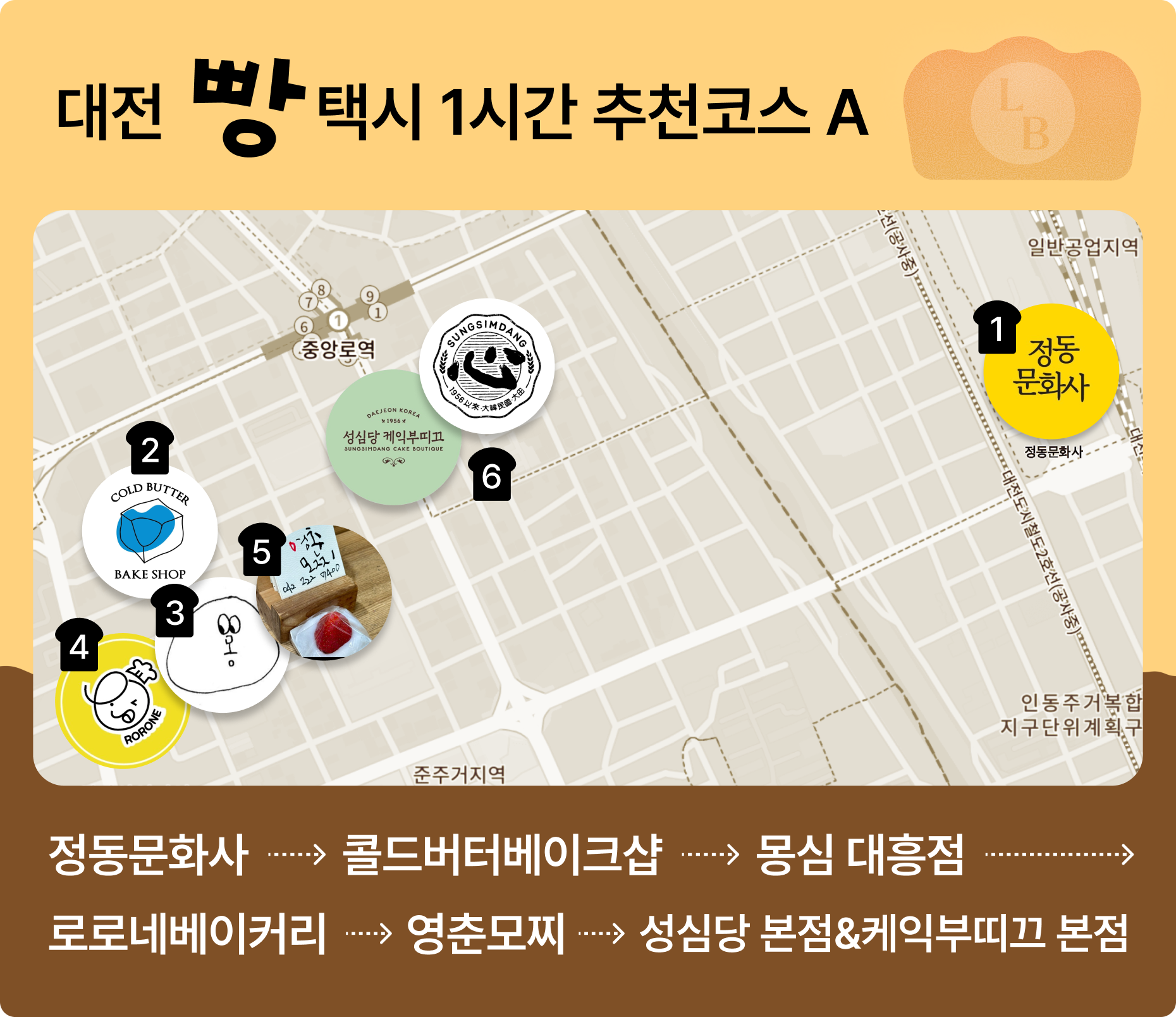 이때의 기준은 ‘맛’과 ‘동선의 효율성’. 맛은 기본 요소라면, 효율성은 그가 가진 노하우를 발휘하는 영역이에요. 손님이 주어진 시간 안에 최대한 많은 곳에 갈 수 있도록 돕기 위해서죠. ‘대전 빵택시 1시간 추천코스 A’를 볼까요? 정동문화사에서 성심당 본점까지. 총 6곳을 찾아가는 코스죠.