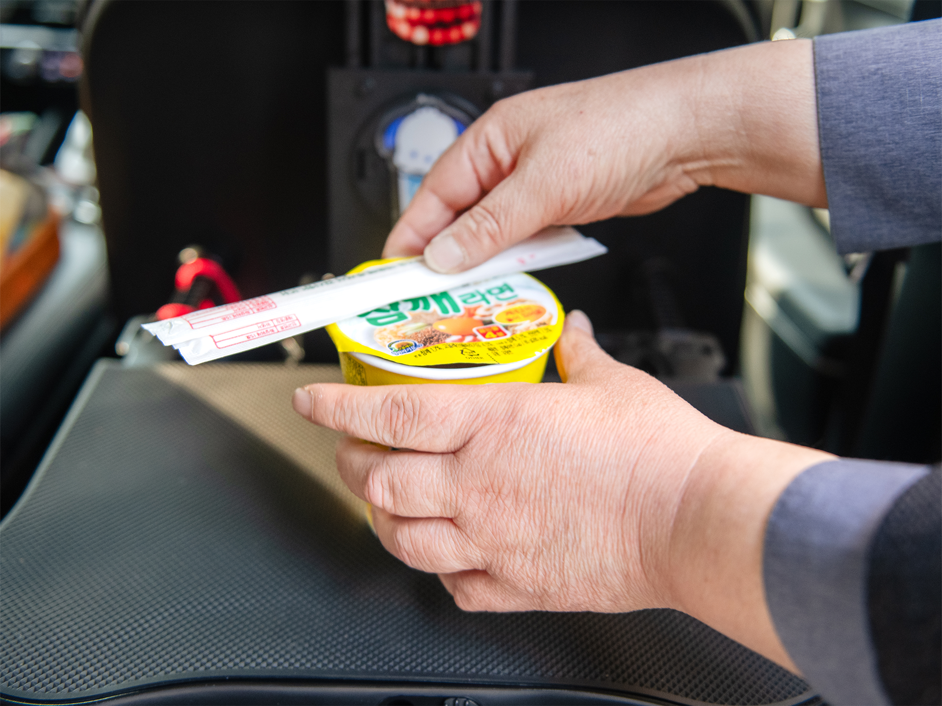 실제로 그는 투어 중 손님이 ‘느끼하다고 생각할 타이밍’까지 고민하고 있었어요. 네 번째 빵집으로 향하던 때였을까요. 그는 편의점 근처에 차를 세우더니 “잠시만 기다려 달라”고 했어요. 5분이 지났을 즈음, 근처 편의점에서 얼큰한 컵라면을 하나 끓여 왔죠.