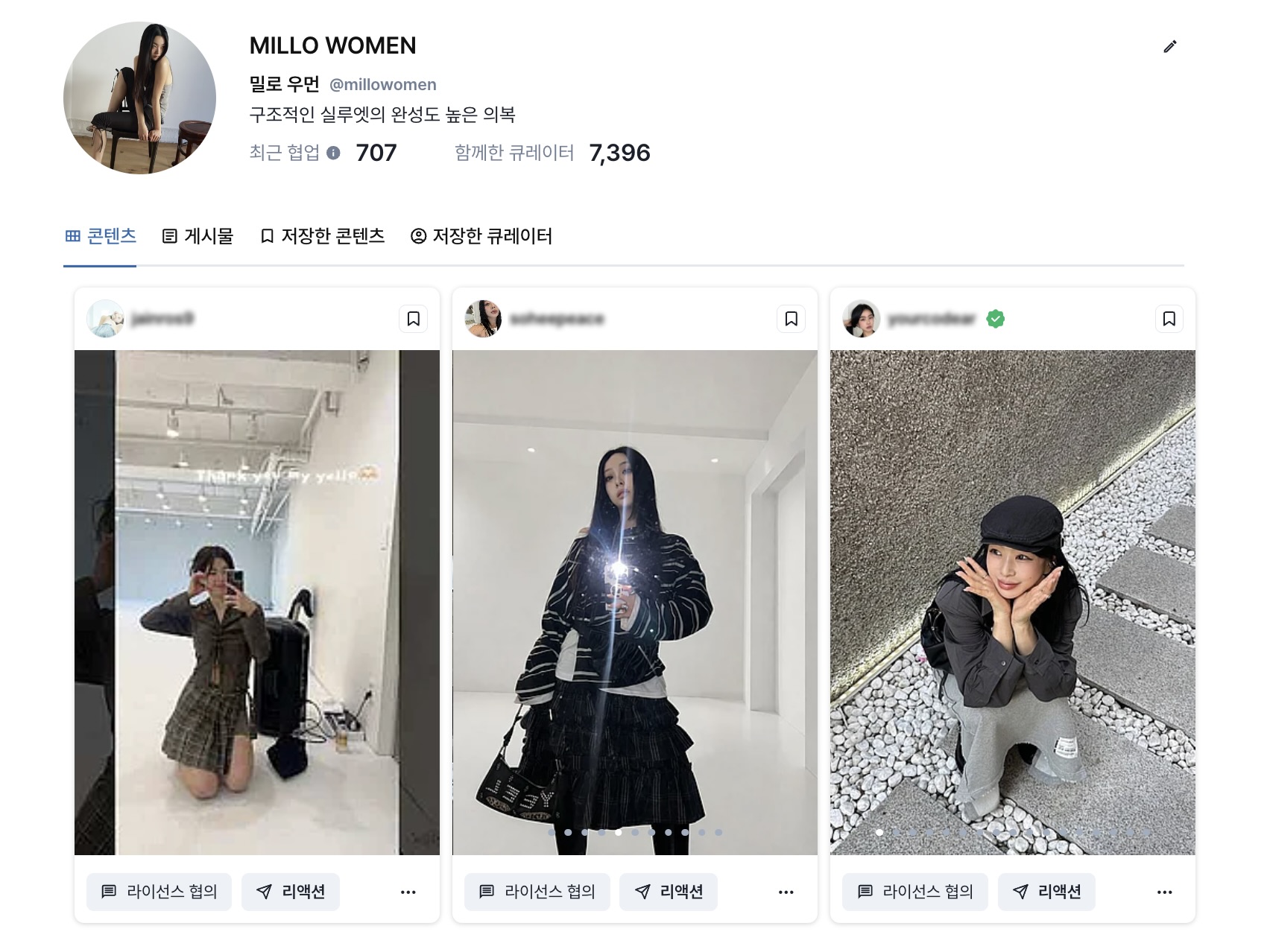 실제 효과는 어떨까요? 패션 브랜드 밀로우먼MILLO WOMEN은 22개월간 브랜더진을 써왔어요. 지금까지 233명의 크리에이터가 밀로우먼의 옷을 빌려입었죠. 325개의 콘텐츠가 만들어졌고, 총 1786만 노출과 49만 건의 반응(좋아요·댓글·공유 등)을 기록했어요. 평균 반응률은 4.86%. 대형 인플루언서 캠페인 평균 대비 약 2배 이상 높은 수치예요.
