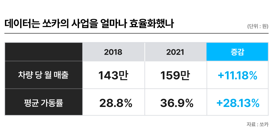 쏘카의 가동률은 2018년 이후 3년 동안 28% 개선됐습니다. 덕분에 차량 한 대가 매달 올리는 매출도 2018년 143만원에서 2021년 159만원으로 늘었다고요.