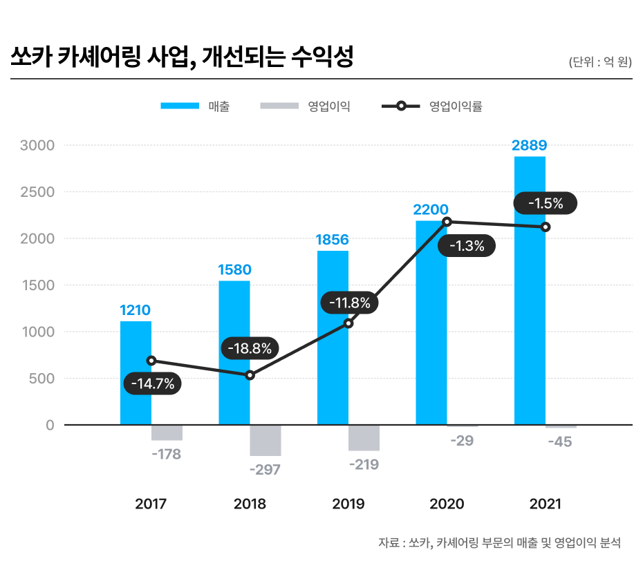 2018년 이후 쏘카의 카셰어링 실적은 지속적으로 성장하고 있습니다. 2018년 1580억원이던 매출은 2021년 2889억원으로, 3년 만에 거의 두 배가 됐습니다. 더 주목할만한 것은 수익성입니다. 2018년 297억원의 영업 손실(영업이익률 -18.8%)을 본 쏘카는 2021년 손실을 45억원(영업이익률 -1.5%)으로 줄이면서 손익분기점에 바짝 접근했습니다.