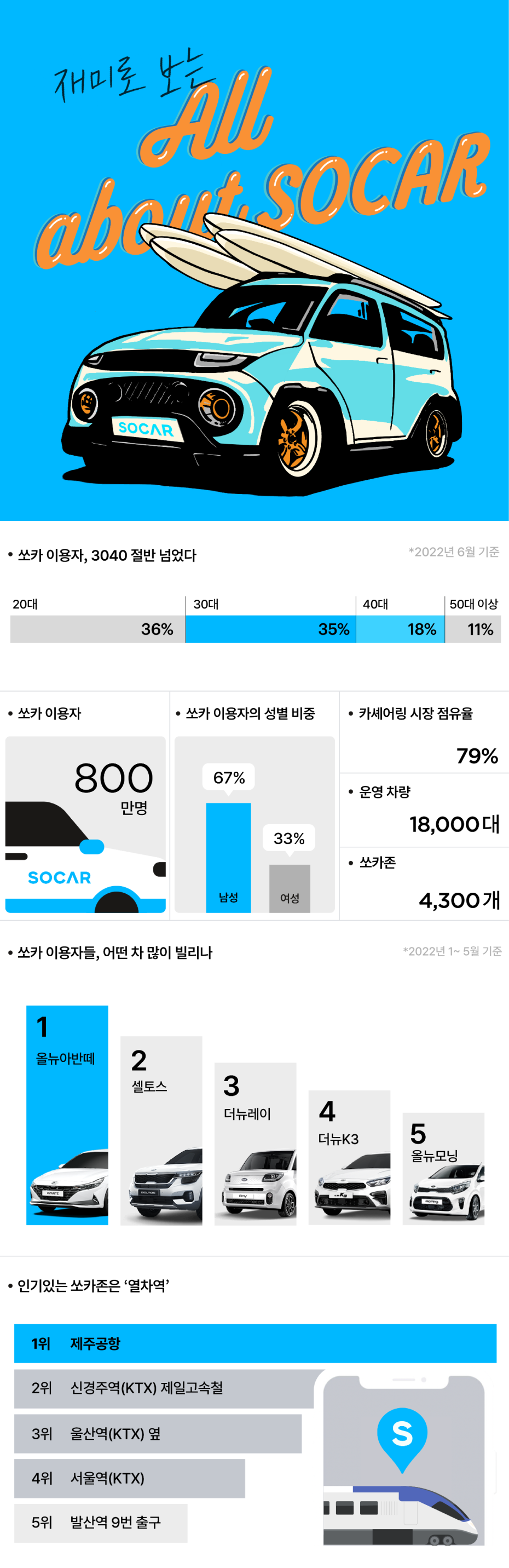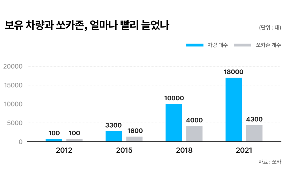 쏘카가 11년이나 된 기업인 거 알고 계셨나요. 국내 최대 카셰어링car-sharing 서비스입니다. 2022년 상반기 기준 앱 누적 다운로드 1000만 건, 회원 800만명. 전국 4300여개 쏘카존에서 1만8000여대의 차량을 운영하고 있습니다.
