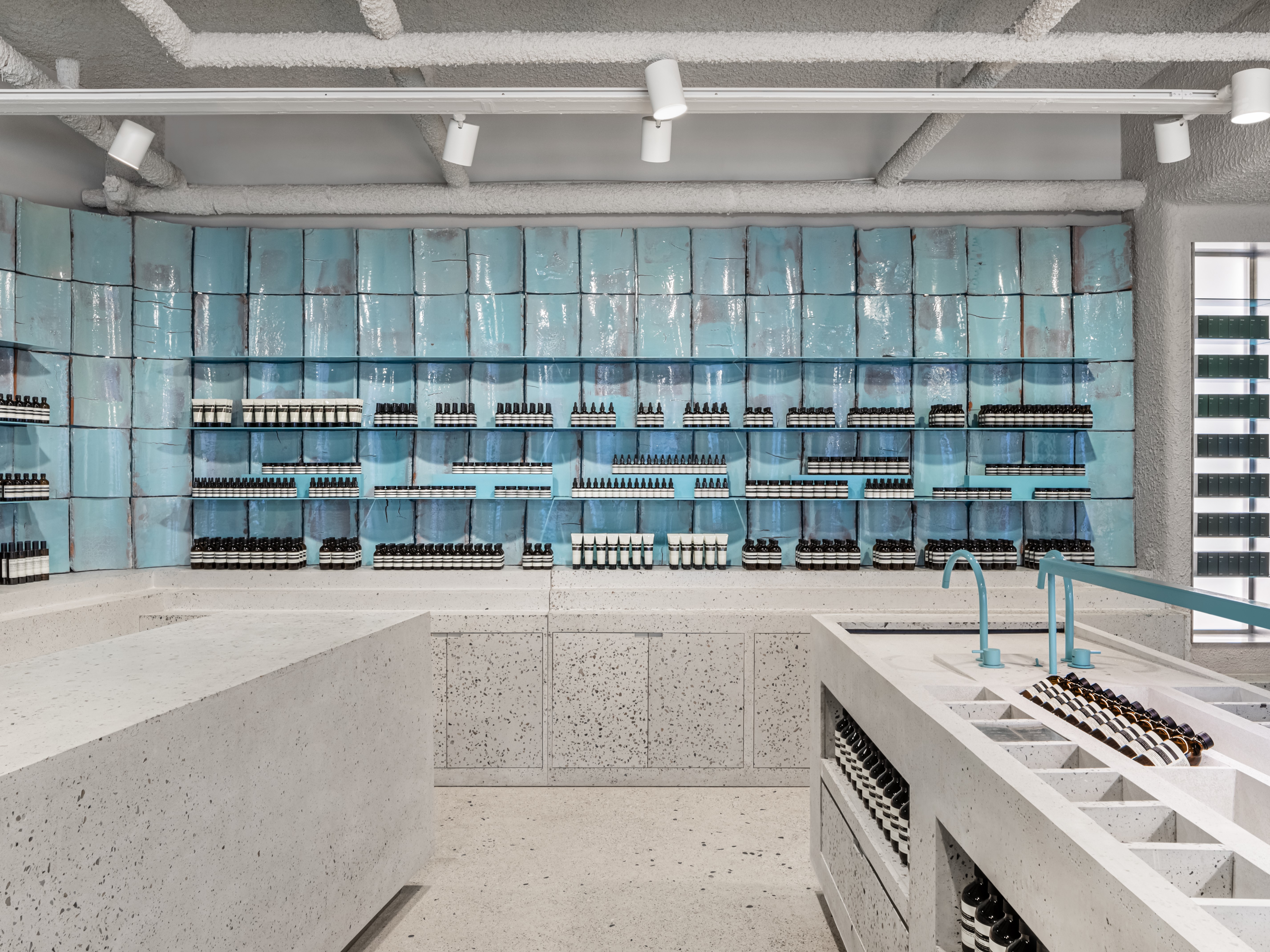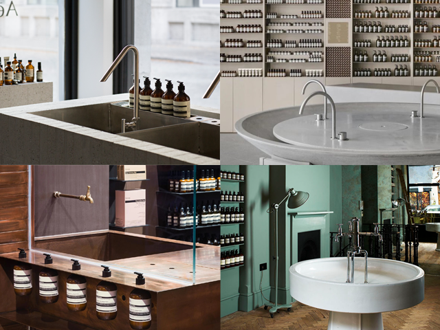 서울 강남구 가로수길에 위치한 이솝 가로수길. 대부분의 한국 석재 문화재, 맷돌 등에 쓰인 화강석을 카운터와 싱크에 사용했다. ⓒ이솝코리아