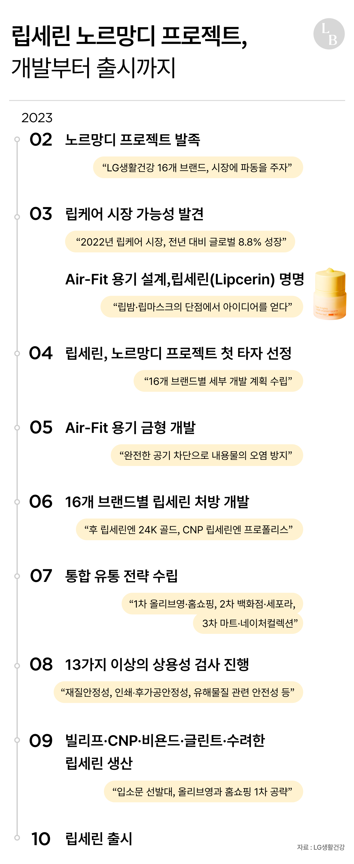 생각해 봐. 노르망디 전략의 첫 타자로 립세린이 지목된 건 올해 2월이야. 그리고 첫 제품이 나온 건 10월. 무수한 조율을 거치면서 제형과 용기를 동시에 개발했어. 이 과정을 지휘한 김세라 부문장조차 “이렇게 속도감을 내본 건 처음”이라고 말할 정도였지. 이런 프로젝트라면 보통 1년 반은 걸리거든.