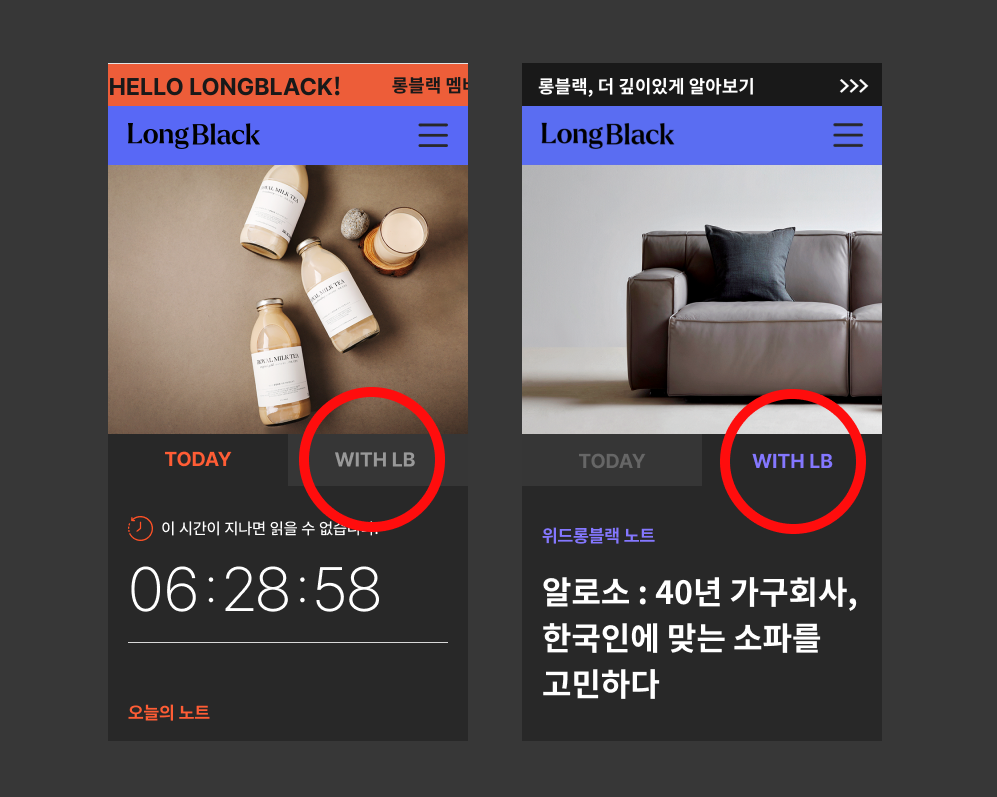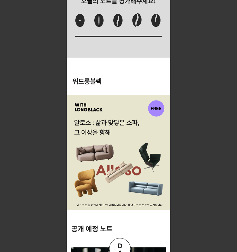 오늘의 노트 옆에 추가의 탭이 생깁니다. 위드 롱블랙 탭을 클릭하시면 콘텐츠를 읽으실 수 있습니다. 한번 발행된 위드 롱블랙은 일주일 동안 메인 화면에서 노출됩니다.
