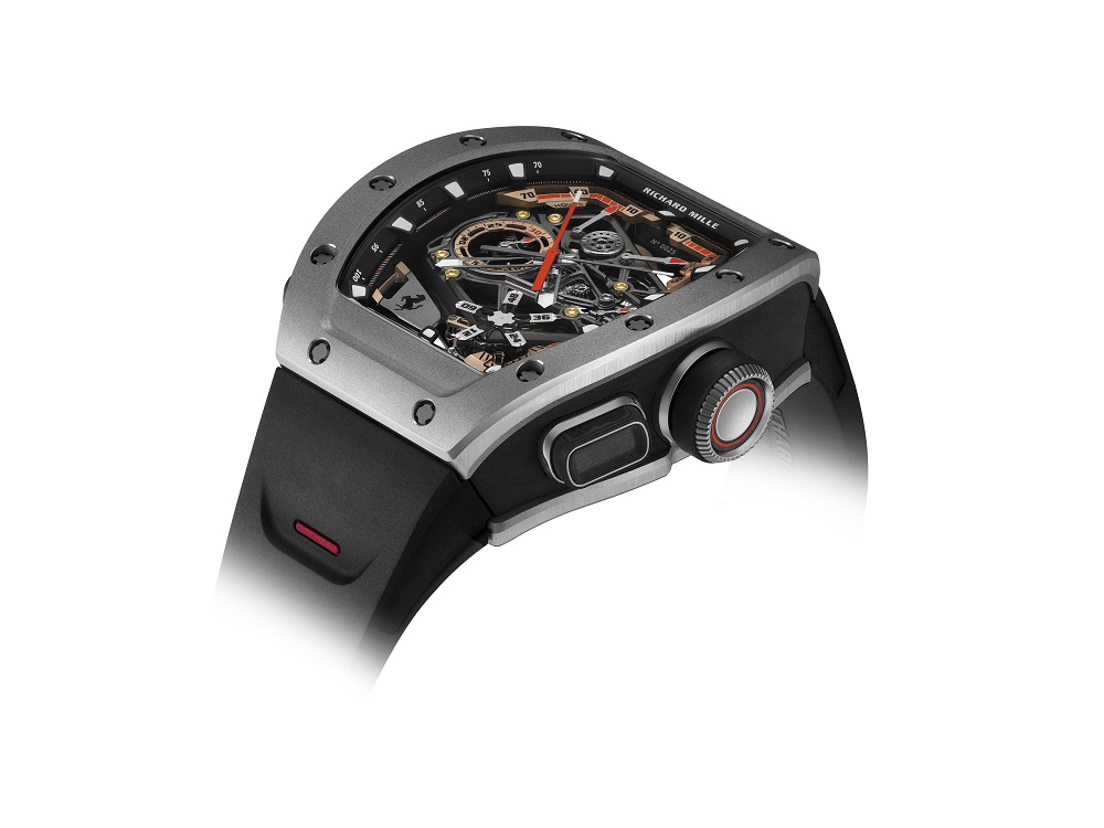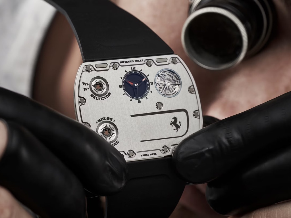 리차드 밀은 최근 페라리와 함께 만든 두 제품을 선보였습니다. RM 43-01 투르비용 스플릿 세컨즈 크로노그래프Tourbillon Split-Seconds Chronograph. 티타늄과 카본 TPT® 소재 케이스로 각각 75점씩만 생산됩니다.