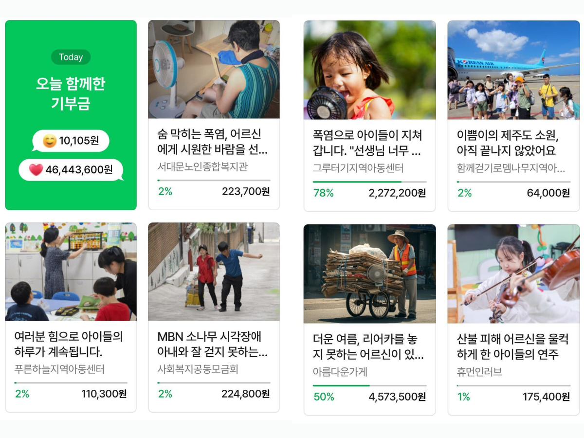 시작은 네이버 사회공헌팀이 만든 웹사이트였어요. 160개 넘는 작은 사회단체들이 모인 기부 플랫폼이었죠.