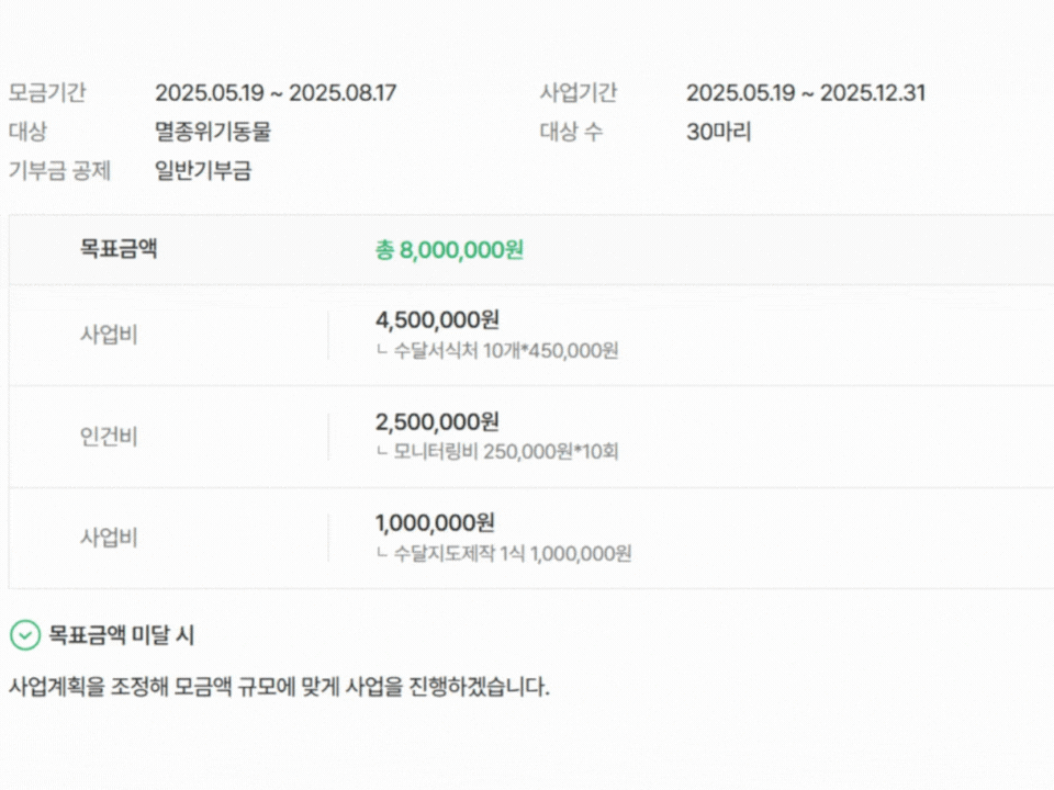 진솔한 이야기만큼 중요한 게 또 있어요. 바로 ‘투명한 정보’. 상세 페이지 끝에는 이 기부금을 어디에 쓸지 항목별로 예산을 쓰게 합니다. 또 모금이 완료되면 ‘기부 후기’를 통해서 실제로 어떻게 프로젝트가 진행됐는지를 기부자들에게 설명해요.